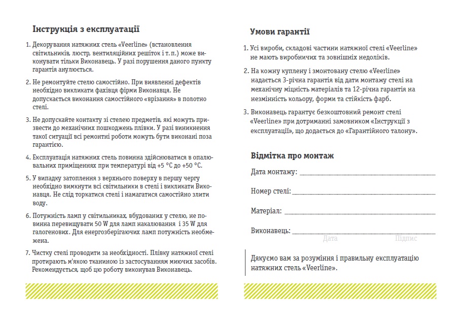 100% гарантии и сервиса! Монтаж натяжных потолков осуществляется квалифицированными монтажными бригадами компании, имеющими допуск к работе с газовым и электро оборудованием. На все работы устанавливается гарантийные сроки (3 года на монтажные работы и 12ти летняя гарантия на натяжное полотно и комплектующие) и предоставляется сервисное обслуживание.Компания благодарит Вас за правильную эксплуатацию натяжных потолков «Veerline».
